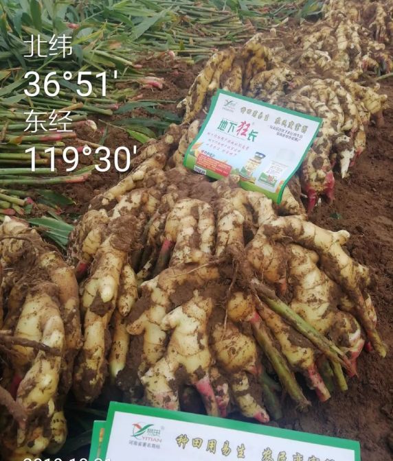 2019年10月20日,易生科技售后服务组来到昌邑,回访这位农户,这位农户说喷施地下狂长了五遍,效果非常好,颜色金黄光亮,姜指头粗胖,出姜时不易破盘,连接点粗。像这样好的姜地里基本都是,还说今年的大姜比往年的都好。